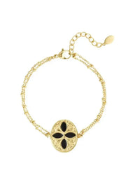 De armband bestaat uit twee fijne kettinkjes die samenkomen in een ovale bedel met een uniek patroon. De zwarte accenten zorgen voor diepte en contrast, waardoor deze armband perfect past bij zowel een casual als chique outfit.