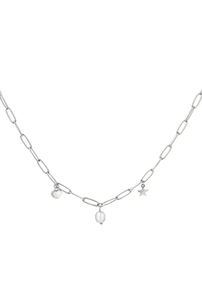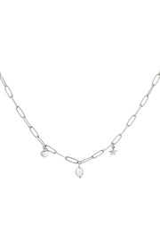 Deze zilveren schakelketting is een echte aanrader! De ketting is versierd met drie speelse bedels namelijk een hartje, een ster en een parel. Een sieraad die jouw look meteen een vrolijke en trendy uitstraling geeft.